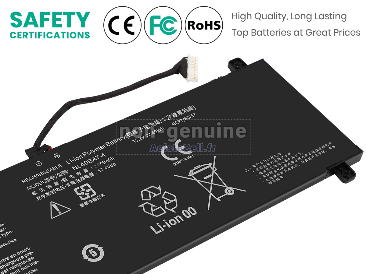 Nos batteries de remplacement Clevo NL50G1 sont méticuleusement conçues et fabriquées à l'aide des technologies les plus avancées et de matériaux de première qualité. Chaque batterie est soumise à un contrôle rigoureux du processus de production afin de s'assurer qu'elle respecte et dépasse les normes internationales telles que CE, UL, ROHS et ISO 9001/9002.